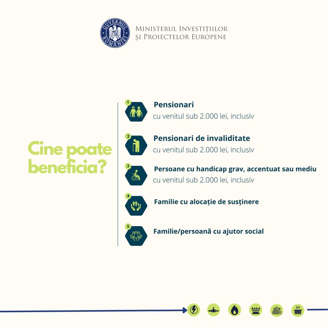 1.400 de lei sprijin din bani europeni pentru plata facturilor la energie pentru persoanele vulnerabile. Ajutorul va fi distribuit în două tranșe, a câte 700 de lei fiecare: în februarie 2023 și în septembrie 2023.Se pot plăti o parte din cheltuielile cu energia, indiferent de natura acesteia: energie electrică, energie termică centralizată, gaze, butelie, lemne pentru foc, păcură, peleţi şi alte materiale de încălzire.