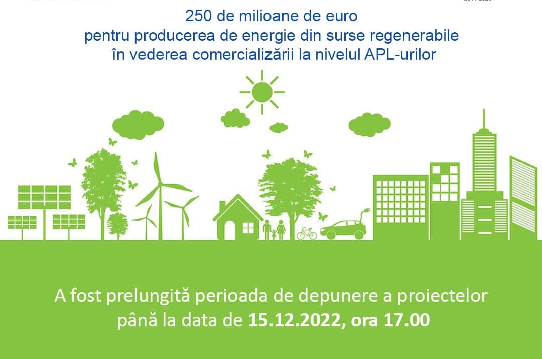 Ministerul Investițiilor și Proiectelor Europene, prin Autoritatea de Management pentru Programul Operațional Infrastructură Mare, prelungește pelul de proiecte dedicat autorităților administrației publice locale -Măsuri de îmbunătățire a eficienței energetice și stimularea utilizării energiei regenerabile, Obiectivul specific 11.2: Utilizarea energiei din surse regenerabile la nivelul autorităților publice locale până la data de 15.12.2022, ora 17.00.