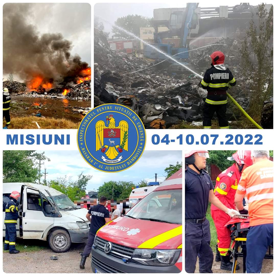 În ultima săptămână, pompierii dâmbovițeni au lucrat la foc continuu, 8 incendii la gospodăriile populaţiei (locuinţe si anexe gospodăreşti etc.), 2 incendii de vegetație uscată, 12 acţiuni la accidente rutiere, 1 misiune pirotehnică pentru distrugere muniție asanată, 4 acţiuni pentru evacuare apă din gospodării, 20 acţiuni pentru asistența persoanelor, 214 cazuri medicale şi 17 acţiuni la alte situaţii de urgenţă. Au fost executate 36 misiuni de recunoaștere și de informare în localitățile din raioanele de intervenție, 6 exerciții cu forțe în teren pentru antrenamentul forțelor de intervenție și 25 acțiuni de verificare la secțiile de ATI ale unităților spitalicești de pe raza județului Dâmbovița, cu scopul de a urmări respectarea măsurilor de prevenire și stingere a incendiilor.