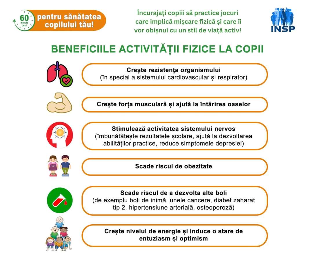Încurajați copiii să practice jocuri care implică mișcare fizică și care îi vor obișnui cu un stil de viață activ!