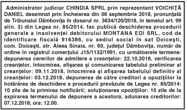 Administrator judiciar CHINDIA SPRL By: Ziarul Dambovita Date: 10/10/2018 FacebookTwitterPinterestWhatsApp Administrator judiciar CHINDIA SPRL TagsAdministrator judiciar CHINDIA SPRL Articolul precedentA FOST APROBAT CUANTUMUL SUBVENŢIILOR CARE SE VOR PLĂTI DIN 16 OCTOMBRIEArticolul următorANUNŢ 10.10.2018 Ziarul Dambovita LĂSAȚI UN MESAJ Renunțați la răspuns Comentariu: Vă rugăm să introduceți comentariul dvs.! Nume:* Introduceți aici numele dvs. Email:* Ați introdus o adresă de e-mail incorectă! Vă rugăm să introduceți adresa dvs. de e-mail aici Website: Salvați numele meu, adresa de e-mail și site-ul web în acest browser pentru data viitoare i comentariu. Δ Acest site folosește Akismet pentru a reduce spamul. Află cum sunt procesate datele comentariilor tale. Popular Adrenalină și suspans la Cinema Independența din Târgoviște: „Anaconda” ajunge pe marele ecran A apărut Almanahul bisericesc 2026 al Arhiepiscopiei Târgoviștei – o oglindă a vieții pastorale și academice contemporane CJ Dâmbovița încheie o nouă ediție a programului de internship Avertisment pentru turiști: Recomandările jandarmilor montani înainte de urcarea în Bucegi Restricții de circulație în Ungaria, pe Drumul Principal 42 punct frontieră Artand-Borș, începând cu 1 ianuarie 2026! ȘtiriDâmbovița Județul Dâmbovița, sub asediul gerului – temperaturi de până la -11 grade Celsius Roxana - Ionela Botea - 02/01/2026 Dimineață geroasă – 2 ianuarie , temperaturi minime înregistrate... Vești bune pentru fermieri: începe depunerea cererilor pentru bunăstarea animalelor (DR-06) Roxana - Ionela Botea - 02/01/2026 Fermierii din sectorul zootehnic au motive de optimism la... Mani Gyenes, din nou la startul Raliului Dakar: România are reprezentant în cursa supremă a anduranței Roxana - Ionela Botea - 02/01/2026 România va fi din nou reprezentată la cel mai... Noi taxe și impozite în vigoare de la 1 ianuarie 2026 Roxana - Ionela Botea - 02/01/2026 Începând cu 1 ianuarie 2026, în România au intrat...