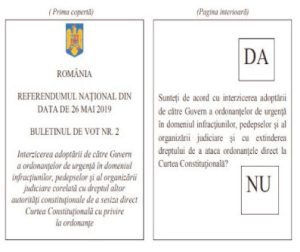 Cetăţenii români cu drept de vot vor primi la referendumul pe teme de justiţie două buletine de vot, al căror model a fost propus de Autoritatea Electorală Permanentă, printr-un proiect de hotărâre de guvern.