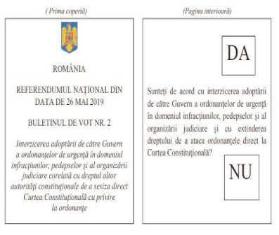 Pe pagina a treia a buletinului de vot (versoul coperţii finale) se imprimă întrebarea precum şi pătratele, cu latura de 4 cm, cuprinzând afirmaţia şi negaţia. Ultima pagină a buletinului de vot (coperta finală) va rămâne goală, pentru aplicarea ştampilei de control.