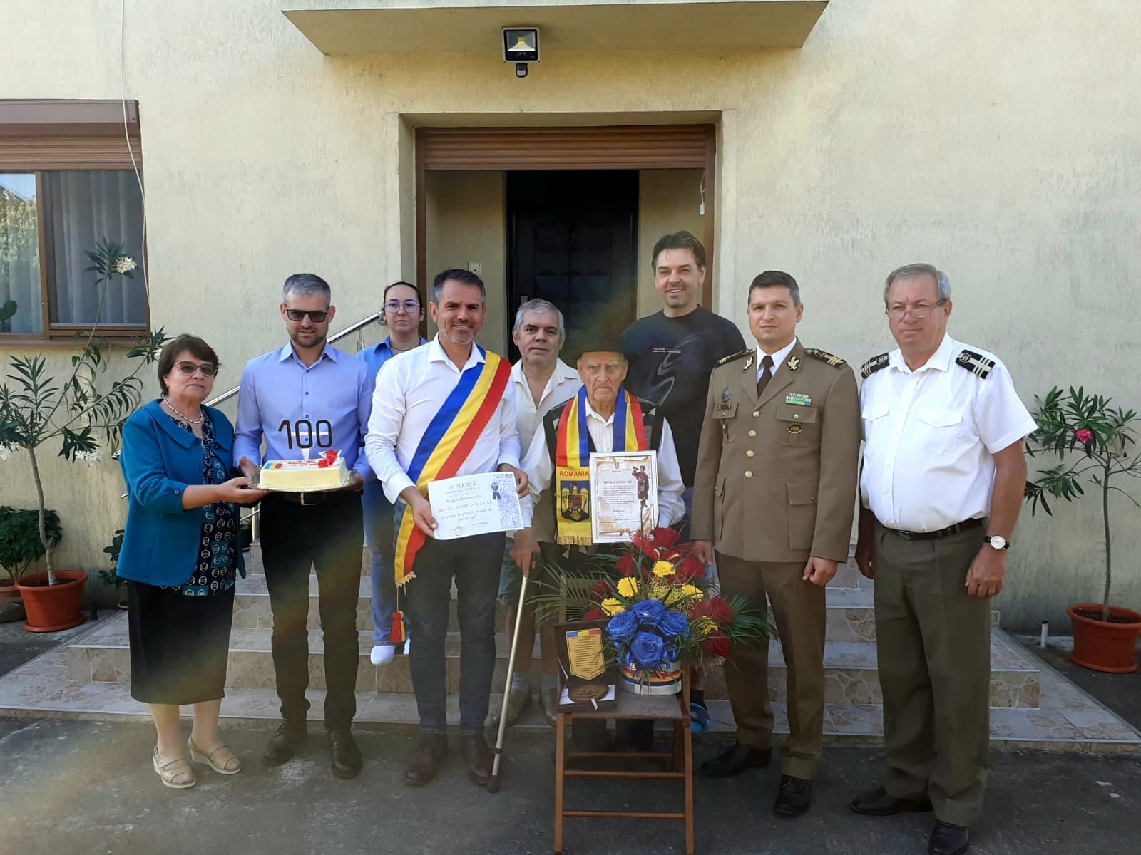 Deși mare a fost surpriza pentru veteranul nostru să primească o așa vizită oficială la centenarul său, s-a grăbit să răspundă pe măsură, s-a gătit iute și și-a luat „Iubitul Tricolor” la gât.