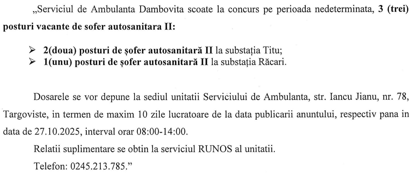 ANUNȚ By: Ziarul Dambovita Date: 13/10/2025 FacebookTwitterPinterestWhatsApp Articolul precedentAccident rutier în municipiul TârgovișteArticolul următorBiserica din Dealu Frumos, comuna Pietroșița, a fost sfințită, președintele CJ Dâmbovița, Corneliu Ștefan, în mijlocul comunității Ziarul Dambovita LĂSAȚI UN MESAJ Renunțați la răspuns Comentariu: Vă rugăm să introduceți comentariul dvs.! Nume:* Introduceți aici numele dvs. Email:* Ați introdus o adresă de e-mail incorectă! Vă rugăm să introduceți adresa dvs. de e-mail aici Website: Salvați numele meu, adresa de e-mail și site-ul web în acest browser pentru data viitoare i comentariu. Popular Eisberg, un reper privind securitatea alimentară a salatelor gata de consum Plafonarea adaosului la alimente, când inflaţia sare de 5% Atenție la bijuterii periculoase! Colierul cu pandantiv fluture vândut online, prezintă riscuri chimice serioase Autoritățile au decis să elimine pagurile impuse laboratoarelor private, astfel încât românii să-și poată face investigații decontate oricând au nevoie, nu doar în primele... Ziua Internațională a Nonviolenței în Școală la Târgoviște ȘtiriDâmbovița ANUNȚ Ziarul Dambovita - 30/01/2026 Municipiul Moreni cu sediul în strada Alexandru Ioan Cuza,... ANUNȚ Ziarul Dambovita - 30/01/2026 Municipiul Moreni cu sediul în strada Alexandru Ioan Cuza,... ANUNȚ Ziarul Dambovita - 30/01/2026 Municipiul Moreni cu sediul în strada Alexandru Ioan Cuza,... ANUNȚ Ziarul Dambovita - 30/01/2026 Municipiul Moreni cu sediul în strada Alexandru Ioan Cuza,...