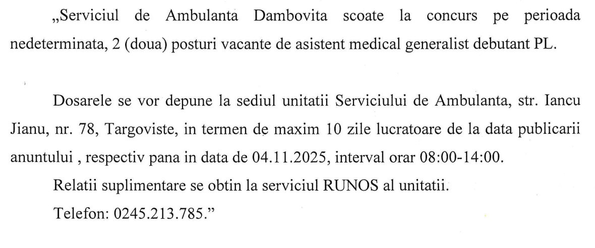 ANUNȚ By: Ziarul Dambovita Date: 21/10/2025 FacebookTwitterPinterestWhatsApp Articolul precedentBărbat reținut pentru braconaj cinegetic în RuncuArticolul următorITM Dâmbovița, în campanie de control: Angajatorii verificați pentru respectarea normelor de protecție împotriva substanțelor chimice periculoase Ziarul Dambovita LĂSAȚI UN MESAJ Renunțați la răspuns Comentariu: Vă rugăm să introduceți comentariul dvs.! Nume:* Introduceți aici numele dvs. Email:* Ați introdus o adresă de e-mail incorectă! Vă rugăm să introduceți adresa dvs. de e-mail aici Website: Salvați numele meu, adresa de e-mail și site-ul web în acest browser pentru data viitoare i comentariu. Popular Eisberg, un reper privind securitatea alimentară a salatelor gata de consum Plafonarea adaosului la alimente, când inflaţia sare de 5% Atenție la bijuterii periculoase! Colierul cu pandantiv fluture vândut online, prezintă riscuri chimice serioase Autoritățile au decis să elimine pagurile impuse laboratoarelor private, astfel încât românii să-și poată face investigații decontate oricând au nevoie, nu doar în primele... Ziua Internațională a Nonviolenței în Școală la Târgoviște ȘtiriDâmbovița ANUNȚ Ziarul Dambovita - 30/01/2026 Municipiul Moreni cu sediul în strada Alexandru Ioan Cuza,... ANUNȚ Ziarul Dambovita - 30/01/2026 Municipiul Moreni cu sediul în strada Alexandru Ioan Cuza,... ANUNȚ Ziarul Dambovita - 30/01/2026 Municipiul Moreni cu sediul în strada Alexandru Ioan Cuza,... ANUNȚ Ziarul Dambovita - 30/01/2026 Municipiul Moreni cu sediul în strada Alexandru Ioan Cuza,...