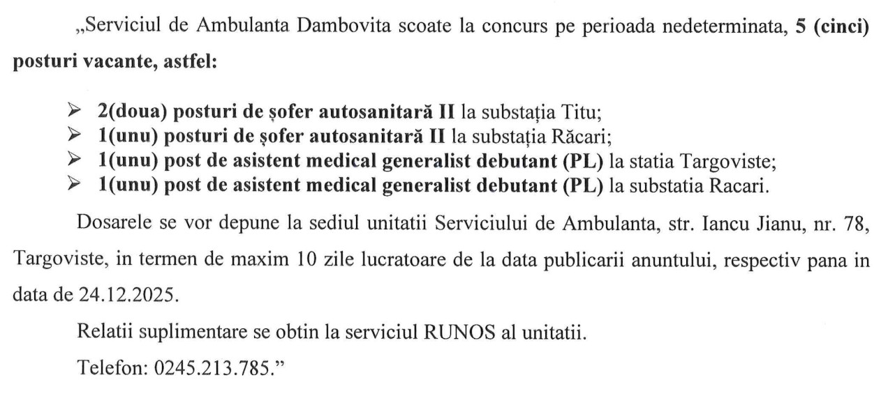 ANUNȚ By: Ziarul Dambovita Date: 10/12/2025 FacebookTwitterPinterestWhatsApp Articolul precedentANUNȚArticolul următorSe strânge lațul în jurul petardelor ilegale, polițiștii intensifică raziile în sezonul sărbătorilor Ziarul Dambovita LĂSAȚI UN MESAJ Renunțați la răspuns Comentariu: Vă rugăm să introduceți comentariul dvs.! Nume:* Introduceți aici numele dvs. Email:* Ați introdus o adresă de e-mail incorectă! Vă rugăm să introduceți adresa dvs. de e-mail aici Website: Salvați numele meu, adresa de e-mail și site-ul web în acest browser pentru data viitoare i comentariu. Popular Eisberg, un reper privind securitatea alimentară a salatelor gata de consum Plafonarea adaosului la alimente, când inflaţia sare de 5% Atenție la bijuterii periculoase! Colierul cu pandantiv fluture vândut online, prezintă riscuri chimice serioase Autoritățile au decis să elimine pagurile impuse laboratoarelor private, astfel încât românii să-și poată face investigații decontate oricând au nevoie, nu doar în primele... Ziua Internațională a Nonviolenței în Școală la Târgoviște ȘtiriDâmbovița ANUNȚ Ziarul Dambovita - 30/01/2026 Municipiul Moreni cu sediul în strada Alexandru Ioan Cuza,... ANUNȚ Ziarul Dambovita - 30/01/2026 Municipiul Moreni cu sediul în strada Alexandru Ioan Cuza,... ANUNȚ Ziarul Dambovita - 30/01/2026 Municipiul Moreni cu sediul în strada Alexandru Ioan Cuza,... ANUNȚ Ziarul Dambovita - 30/01/2026 Municipiul Moreni cu sediul în strada Alexandru Ioan Cuza,...