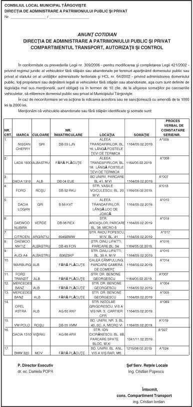 ANUNŢ COTIDIAN DIRECŢIA DE ADMINISTRARE A PATRIMONIULUI PUBLIC ŞI PRIVAT COMPARTIMENTUL TRANSPORT, AUTORIZAŢII ŞI CONTROL