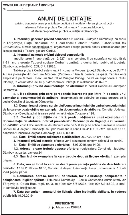 ANUNŢ DE LICITAŢIE privind concesionarea prin licitaţie publică a imobilelor – teren şi construcţii -aferente Taberei şcolare Cerbul, situată în comuna Moroeni, aflate în proprietatea publică a judeţului Dâmboviţa