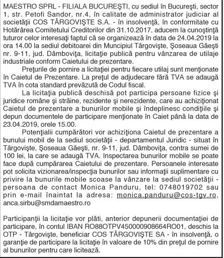 ANUNŢ DE LICITAŢIE PUBLICĂ PENTRU VÂNZARE BUNURI By: Ziarul Dambovita Date: 12/04/2019 FacebookTwitterPinterestWhatsApp ANUNŢ DE LICITAŢIE PUBLICĂ PENTRU VÂNZARE BUNURI TagsANUNŢ DE LICITAŢIE PUBLICĂ PENTRU VÂNZARE BUNURI Articolul precedentConsiliul Judeţean Dâmboviţa organizează concurs de recrutare pentru ocuparea funcţiei publice de execuţie vacante:Articolul următorCJ Dâmboviţa demontează afirmaţiile mincinoase privind împărţirea banilor către primării în mod discreţionar Ziarul Dambovita LĂSAȚI UN MESAJ Renunțați la răspuns Comentariu: Vă rugăm să introduceți comentariul dvs.! Nume:* Introduceți aici numele dvs. Email:* Ați introdus o adresă de e-mail incorectă! Vă rugăm să introduceți adresa dvs. de e-mail aici Website: Salvați numele meu, adresa de e-mail și site-ul web în acest browser pentru data viitoare i comentariu. Δ Acest site folosește Akismet pentru a reduce spamul. Află cum sunt procesate datele comentariilor tale. Popular Adrenalină și suspans la Cinema Independența din Târgoviște: „Anaconda” ajunge pe marele ecran A apărut Almanahul bisericesc 2026 al Arhiepiscopiei Târgoviștei – o oglindă a vieții pastorale și academice contemporane CJ Dâmbovița încheie o nouă ediție a programului de internship Avertisment pentru turiști: Recomandările jandarmilor montani înainte de urcarea în Bucegi Restricții de circulație în Ungaria, pe Drumul Principal 42 punct frontieră Artand-Borș, începând cu 1 ianuarie 2026! ȘtiriDâmbovița Județul Dâmbovița, sub asediul gerului – temperaturi de până la -11 grade Celsius Roxana - Ionela Botea - 02/01/2026 Dimineață geroasă – 2 ianuarie , temperaturi minime înregistrate... Vești bune pentru fermieri: începe depunerea cererilor pentru bunăstarea animalelor (DR-06) Roxana - Ionela Botea - 02/01/2026 Fermierii din sectorul zootehnic au motive de optimism la... Mani Gyenes, din nou la startul Raliului Dakar: România are reprezentant în cursa supremă a anduranței Roxana - Ionela Botea - 02/01/2026 România va fi din nou reprezentată la cel mai... Noi taxe și impozite în vigoare de la 1 ianuarie 2026 Roxana - Ionela Botea - 02/01/2026 Începând cu 1 ianuarie 2026, în România au intrat...