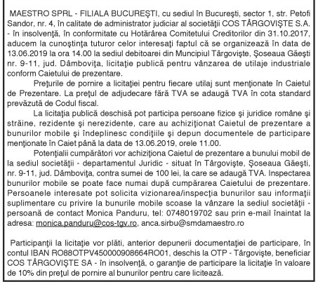 ANUNŢ DE LICITAŢIE PUBLICĂ PENTRU VÂNZARE BUNURI By: Ziarul Dambovita Date: 22/05/2019 FacebookTwitterPinterestWhatsApp ANUNŢ DE LICITAŢIE PUBLICĂ PENTRU VÂNZARE BUNURI TagsANUNŢ DE LICITAŢIE PUBLICĂ PENTRU VÂNZARE BUNURI Articolul precedentSORANA CIRSTEA, PE LOCUL 93 WTAArticolul următorConsiliul Judeţean Dâmboviţa organizează concurs de recrutare pentru ocuparea funcţiilor publice de execuţie vacante Ziarul Dambovita LĂSAȚI UN MESAJ Renunțați la răspuns Comentariu: Vă rugăm să introduceți comentariul dvs.! Nume:* Introduceți aici numele dvs. Email:* Ați introdus o adresă de e-mail incorectă! Vă rugăm să introduceți adresa dvs. de e-mail aici Website: Salvați numele meu, adresa de e-mail și site-ul web în acest browser pentru data viitoare i comentariu. Popular Transport ilegal de material lemnos, descoperit de polițiști în Braniștea Activitate educativ-duhovnicească dedicată Sfinților Trei Ierarhi, la Bucșani Eisberg, un reper privind securitatea alimentară a salatelor gata de consum Plafonarea adaosului la alimente, când inflaţia sare de 5% Atenție la bijuterii periculoase! Colierul cu pandantiv fluture vândut online, prezintă riscuri chimice serioase ȘtiriDâmbovița Atenție, nou val de fraude financiare online Roxana - Ionela Botea - 30/01/2026 Autoritățile atrag atenția asupra unei campanii de fraudă online... Transport ilegal de material lemnos, descoperit de polițiști în Braniștea Roxana - Ionela Botea - 30/01/2026 Polițiștii din cadrul Poliției Orașului Titu au identificat un... AJF Dâmbovița dă startul înscrierilor pentru un nou curs de formare arbitri Roxana - Ionela Botea - 30/01/2026 „Intră în joc!” Asociația Județeană de Fotbal Dâmbovița a anunțat... Chindia Târgoviște joacă acasă!Meci cu ARO Muscelul Câmpulung Muscel, intrare liberă pentru suporteri Roxana - Ionela Botea - 30/01/2026 Vești excelente pentru iubitorii fotbalului din Târgoviște! Chindia Târgoviște...