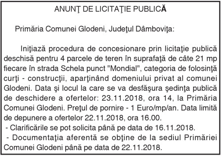 ANUNŢ DE LICITAŢIE PUBLICĂ Primăria Comunei Glodeni judetul dambovita