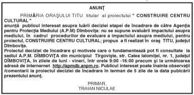 ANUNŢ PRIMĂRIA ORAŞULUI TITU titular al proiectului ” CONSTRUIRE CENTRU CULTURAL” By: Ziarul Dambovita Date: 03/09/2018 FacebookTwitterPinterestWhatsApp ANUNŢ PRIMĂRIA ORAŞULUI TITU titular al proiectului ” CONSTRUIRE CENTRU CULTURAL” TagsANUNŢ PRIMĂRIA ORAŞULUI TITU titular al proiectului " CONSTRUIRE CENTRU CULTURAL" Articolul precedentPsihologia politică şi apărarea socială (XX)Articolul următorSOCIETATEA UZINA AUTOMECANICA MORENI S.A.,cu sediul în Moreni, str. Teiş, nr. 16, judeţul Dâmboviţa, NRC J15/22/2001, cod fiscal RO 938970, telefon 0245-666830, fax 0245-665300, e-mail: automecanica@uamoreni.ro, scoate la vânzare prin negociere directă, în perioada 10.09.2018 – 28.09.2018, bunuri (maşini unelte second hand), rămase neadjudecate la licitaţie. Negocierile au loc de luni – vineri între orele 800 – 1400 la sediul societăţii. Ziarul Dambovita LĂSAȚI UN MESAJ Renunțați la răspuns Comentariu: Vă rugăm să introduceți comentariul dvs.! Nume:* Introduceți aici numele dvs. Email:* Ați introdus o adresă de e-mail incorectă! Vă rugăm să introduceți adresa dvs. de e-mail aici Website: Salvați numele meu, adresa de e-mail și site-ul web în acest browser pentru data viitoare i comentariu. Δ Acest site folosește Akismet pentru a reduce spamul. Află cum sunt procesate datele comentariilor tale. Popular Adrenalină și suspans la Cinema Independența din Târgoviște: „Anaconda” ajunge pe marele ecran A apărut Almanahul bisericesc 2026 al Arhiepiscopiei Târgoviștei – o oglindă a vieții pastorale și academice contemporane CJ Dâmbovița încheie o nouă ediție a programului de internship Avertisment pentru turiști: Recomandările jandarmilor montani înainte de urcarea în Bucegi Restricții de circulație în Ungaria, pe Drumul Principal 42 punct frontieră Artand-Borș, începând cu 1 ianuarie 2026! ȘtiriDâmbovița Județul Dâmbovița, sub asediul gerului – temperaturi de până la -11 grade Celsius Roxana - Ionela Botea - 02/01/2026 Dimineață geroasă – 2 ianuarie , temperaturi minime înregistrate... Vești bune pentru fermieri: începe depunerea cererilor pentru bunăstarea animalelor (DR-06) Roxana - Ionela Botea - 02/01/2026 Fermierii din sectorul zootehnic au motive de optimism la... Mani Gyenes, din nou la startul Raliului Dakar: România are reprezentant în cursa supremă a anduranței Roxana - Ionela Botea - 02/01/2026 România va fi din nou reprezentată la cel mai... Noi taxe și impozite în vigoare de la 1 ianuarie 2026 Roxana - Ionela Botea - 02/01/2026 Începând cu 1 ianuarie 2026, în România au intrat...