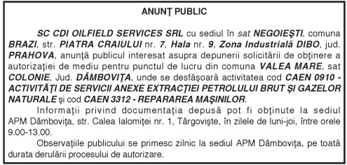 ANUNŢ PUBLIC By: Ziarul Dambovita Date: 14/11/2018 FacebookTwitterPinterestWhatsApp ANUNŢ PUBLIC TagsANUNȚ PUBLIC Articolul precedentAU ÎNCEPUT CONFERINŢELE PASTORAL MISIONARE DIN A DOUA PARTE A ANULUI PENTRU PREOŢII DIN ARHIEPISCOPIA TÂRGOVIŞTEIArticolul următorINFORMARE Ziarul Dambovita LĂSAȚI UN MESAJ Renunțați la răspuns Comentariu: Vă rugăm să introduceți comentariul dvs.! Nume:* Introduceți aici numele dvs. Email:* Ați introdus o adresă de e-mail incorectă! Vă rugăm să introduceți adresa dvs. de e-mail aici Website: Salvați numele meu, adresa de e-mail și site-ul web în acest browser pentru data viitoare i comentariu. Δ Acest site folosește Akismet pentru a reduce spamul. Află cum sunt procesate datele comentariilor tale. Popular Adrenalină și suspans la Cinema Independența din Târgoviște: „Anaconda” ajunge pe marele ecran A apărut Almanahul bisericesc 2026 al Arhiepiscopiei Târgoviștei – o oglindă a vieții pastorale și academice contemporane CJ Dâmbovița încheie o nouă ediție a programului de internship Avertisment pentru turiști: Recomandările jandarmilor montani înainte de urcarea în Bucegi Restricții de circulație în Ungaria, pe Drumul Principal 42 punct frontieră Artand-Borș, începând cu 1 ianuarie 2026! ȘtiriDâmbovița Județul Dâmbovița, sub asediul gerului – temperaturi de până la -11 grade Celsius Roxana - Ionela Botea - 02/01/2026 Dimineață geroasă – 2 ianuarie , temperaturi minime înregistrate... Vești bune pentru fermieri: începe depunerea cererilor pentru bunăstarea animalelor (DR-06) Roxana - Ionela Botea - 02/01/2026 Fermierii din sectorul zootehnic au motive de optimism la... Mani Gyenes, din nou la startul Raliului Dakar: România are reprezentant în cursa supremă a anduranței Roxana - Ionela Botea - 02/01/2026 România va fi din nou reprezentată la cel mai... Noi taxe și impozite în vigoare de la 1 ianuarie 2026 Roxana - Ionela Botea - 02/01/2026 Începând cu 1 ianuarie 2026, în România au intrat...