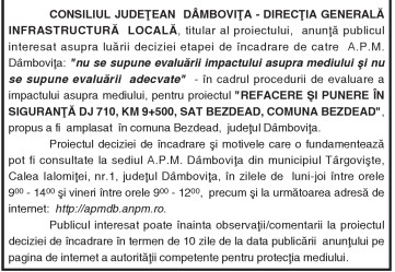 ANUNŢ PUBLIC By: Ziarul Dambovita Date: 23/04/2019 FacebookTwitterPinterestWhatsApp ANUNŢ PUBLIC TagsANUNȚ PUBLIC Articolul precedentPRIMĂRIA MUNICIPIULUI TÂRGOVIŞTE Str. Revoluţiei nr. 1-3, TârgovişteArticolul următorSC METAPLAST SRL Ziarul Dambovita LĂSAȚI UN MESAJ Renunțați la răspuns Comentariu: Vă rugăm să introduceți comentariul dvs.! Nume:* Introduceți aici numele dvs. Email:* Ați introdus o adresă de e-mail incorectă! Vă rugăm să introduceți adresa dvs. de e-mail aici Website: Salvați numele meu, adresa de e-mail și site-ul web în acest browser pentru data viitoare i comentariu. Δ Acest site folosește Akismet pentru a reduce spamul. Află cum sunt procesate datele comentariilor tale. Popular Adrenalină și suspans la Cinema Independența din Târgoviște: „Anaconda” ajunge pe marele ecran A apărut Almanahul bisericesc 2026 al Arhiepiscopiei Târgoviștei – o oglindă a vieții pastorale și academice contemporane CJ Dâmbovița încheie o nouă ediție a programului de internship Avertisment pentru turiști: Recomandările jandarmilor montani înainte de urcarea în Bucegi Restricții de circulație în Ungaria, pe Drumul Principal 42 punct frontieră Artand-Borș, începând cu 1 ianuarie 2026! ȘtiriDâmbovița Județul Dâmbovița, sub asediul gerului – temperaturi de până la -11 grade Celsius Roxana - Ionela Botea - 02/01/2026 Dimineață geroasă – 2 ianuarie , temperaturi minime înregistrate... Vești bune pentru fermieri: începe depunerea cererilor pentru bunăstarea animalelor (DR-06) Roxana - Ionela Botea - 02/01/2026 Fermierii din sectorul zootehnic au motive de optimism la... Mani Gyenes, din nou la startul Raliului Dakar: România are reprezentant în cursa supremă a anduranței Roxana - Ionela Botea - 02/01/2026 România va fi din nou reprezentată la cel mai... Noi taxe și impozite în vigoare de la 1 ianuarie 2026 Roxana - Ionela Botea - 02/01/2026 Începând cu 1 ianuarie 2026, în România au intrat...