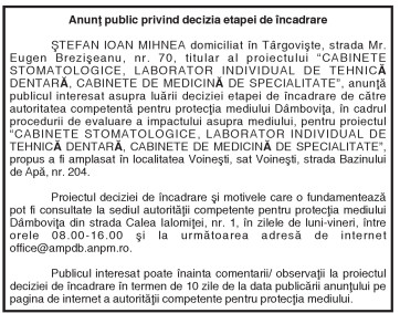 Anunţ public privind decizia etapei de încadrare