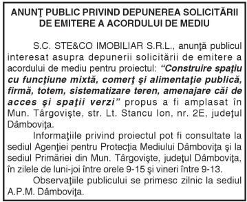 ANUNŢ PUBLIC PRIVIND DEPUNEREA SOLICITĂRII DE EMITERE A ACORDULUI DE MEDIU By: Ziarul Dambovita Date: 31/10/2018 FacebookTwitterPinterestWhatsApp ANUNŢ PUBLIC PRIVIND DEPUNEREA SOLICITĂRII DE EMITERE A ACORDULUI DE MEDIU TagsAnunţ public privind depunerea solicitării de emitere a acordului de mediu Articolul precedentCea mai rea dintre toate lumile posibile (20) De la explozia urbană la bidonville-ul globalArticolul următorANUNŢ PUBLlC PRlVlND DEPUNEREA SOLlClTĂRll DE EMlTERE A ACORDULUl DE MEDlU Ziarul Dambovita LĂSAȚI UN MESAJ Renunțați la răspuns Comentariu: Vă rugăm să introduceți comentariul dvs.! Nume:* Introduceți aici numele dvs. Email:* Ați introdus o adresă de e-mail incorectă! Vă rugăm să introduceți adresa dvs. de e-mail aici Website: Salvați numele meu, adresa de e-mail și site-ul web în acest browser pentru data viitoare i comentariu. Δ Acest site folosește Akismet pentru a reduce spamul. Află cum sunt procesate datele comentariilor tale. Popular Adrenalină și suspans la Cinema Independența din Târgoviște: „Anaconda” ajunge pe marele ecran A apărut Almanahul bisericesc 2026 al Arhiepiscopiei Târgoviștei – o oglindă a vieții pastorale și academice contemporane CJ Dâmbovița încheie o nouă ediție a programului de internship Avertisment pentru turiști: Recomandările jandarmilor montani înainte de urcarea în Bucegi Restricții de circulație în Ungaria, pe Drumul Principal 42 punct frontieră Artand-Borș, începând cu 1 ianuarie 2026! ȘtiriDâmbovița Județul Dâmbovița, sub asediul gerului – temperaturi de până la -11 grade Celsius Roxana - Ionela Botea - 02/01/2026 Dimineață geroasă – 2 ianuarie , temperaturi minime înregistrate... Vești bune pentru fermieri: începe depunerea cererilor pentru bunăstarea animalelor (DR-06) Roxana - Ionela Botea - 02/01/2026 Fermierii din sectorul zootehnic au motive de optimism la... Mani Gyenes, din nou la startul Raliului Dakar: România are reprezentant în cursa supremă a anduranței Roxana - Ionela Botea - 02/01/2026 România va fi din nou reprezentată la cel mai... Noi taxe și impozite în vigoare de la 1 ianuarie 2026 Roxana - Ionela Botea - 02/01/2026 Începând cu 1 ianuarie 2026, în România au intrat...