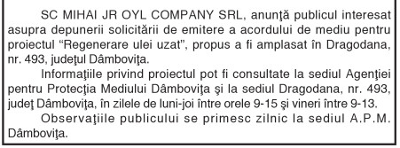 ANUNŢ PUBLIC PRIVIND DEPUNEREA SOLICITĂRII DE EMITERE A ACORDULUI DE MEDIU By: Ziarul Dambovita Date: 05/11/2018 FacebookTwitterPinterestWhatsApp ANUNŢ PUBLIC PRIVIND DEPUNEREA SOLICITĂRII DE EMITERE A ACORDULUI DE MEDIU TagsAnunţ public privind depunerea solicitării de emitere a acordului de mediu Articolul precedentCJ Dâmboviţa susţine performanţele în sportArticolul următorACŢIUNI PENTRU SIGURANŢA TRANSPORTURILOR Ziarul Dambovita LĂSAȚI UN MESAJ Renunțați la răspuns Comentariu: Vă rugăm să introduceți comentariul dvs.! Nume:* Introduceți aici numele dvs. Email:* Ați introdus o adresă de e-mail incorectă! Vă rugăm să introduceți adresa dvs. de e-mail aici Website: Salvați numele meu, adresa de e-mail și site-ul web în acest browser pentru data viitoare i comentariu. Δ Acest site folosește Akismet pentru a reduce spamul. Află cum sunt procesate datele comentariilor tale. Popular Adrenalină și suspans la Cinema Independența din Târgoviște: „Anaconda” ajunge pe marele ecran A apărut Almanahul bisericesc 2026 al Arhiepiscopiei Târgoviștei – o oglindă a vieții pastorale și academice contemporane CJ Dâmbovița încheie o nouă ediție a programului de internship Avertisment pentru turiști: Recomandările jandarmilor montani înainte de urcarea în Bucegi Restricții de circulație în Ungaria, pe Drumul Principal 42 punct frontieră Artand-Borș, începând cu 1 ianuarie 2026! ȘtiriDâmbovița Județul Dâmbovița, sub asediul gerului – temperaturi de până la -11 grade Celsius Roxana - Ionela Botea - 02/01/2026 Dimineață geroasă – 2 ianuarie , temperaturi minime înregistrate... Vești bune pentru fermieri: începe depunerea cererilor pentru bunăstarea animalelor (DR-06) Roxana - Ionela Botea - 02/01/2026 Fermierii din sectorul zootehnic au motive de optimism la... Mani Gyenes, din nou la startul Raliului Dakar: România are reprezentant în cursa supremă a anduranței Roxana - Ionela Botea - 02/01/2026 România va fi din nou reprezentată la cel mai... Noi taxe și impozite în vigoare de la 1 ianuarie 2026 Roxana - Ionela Botea - 02/01/2026 Începând cu 1 ianuarie 2026, în România au intrat...