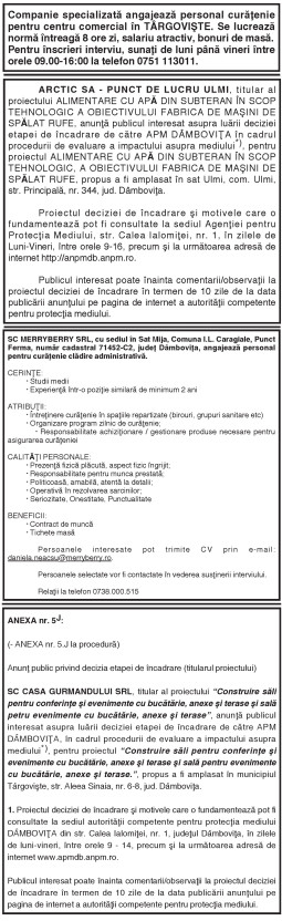 ANUNŢURI By: Ziarul Dambovita Date: 04/08/2020 FacebookTwitterPinterestWhatsApp ANUNŢURI Articolul precedentDelir şi nebunie în perioada interbelică (XXV) De la Rudolf Valentino la Adolf HitlerArticolul următorAvansări în grad şi treceri în rezervă la ISU „Basarab I” Dâmboviţa Ziarul Dambovita LĂSAȚI UN MESAJ Renunțați la răspuns Comentariu: Vă rugăm să introduceți comentariul dvs.! Nume:* Introduceți aici numele dvs. Email:* Ați introdus o adresă de e-mail incorectă! Vă rugăm să introduceți adresa dvs. de e-mail aici Website: Salvați numele meu, adresa de e-mail și site-ul web în acest browser pentru data viitoare i comentariu. Popular Activitate educativ-duhovnicească dedicată Sfinților Trei Ierarhi, la Bucșani Eisberg, un reper privind securitatea alimentară a salatelor gata de consum Plafonarea adaosului la alimente, când inflaţia sare de 5% Atenție la bijuterii periculoase! Colierul cu pandantiv fluture vândut online, prezintă riscuri chimice serioase Autoritățile au decis să elimine pagurile impuse laboratoarelor private, astfel încât românii să-și poată face investigații decontate oricând au nevoie, nu doar în primele... ȘtiriDâmbovița Chindia Târgoviște joacă acasă!Meci cu ARO Muscelul Câmpulung Muscel, intrare liberă pentru suporteri Roxana - Ionela Botea - 30/01/2026 Vești excelente pentru iubitorii fotbalului din Târgoviște! Chindia Târgoviște... Activitate educativ-duhovnicească dedicată Sfinților Trei Ierarhi, la Bucșani Roxana - Ionela Botea - 30/01/2026 Elevii Școlii Gimnaziale „Dora Dalles” au descoperit valorile prieteniei... Rata șomajului în România: 3,29% la finalul lunii decembrie 2025 Roxana - Ionela Botea - 30/01/2026 Peste 263.000 de persoane, înregistrate ca șomeri la nivel... Școala Gimnazială „Tudor Vladimirescu” din Târgoviște se redeschide luna viitoare Roxana - Ionela Botea - 30/01/2026 Condiții moderne și sigure pentru elevi. Primarul municipiului Târgoviște a...