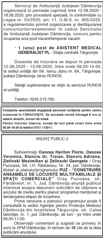 ANUNŢURI By: Ziarul Dambovita Date: 12/08/2020 FacebookTwitterPinterestWhatsApp ANUNŢURI Articolul precedentDelir şi nebunie în perioada interbelică (XXXI) De la Rudolf Valentino la Adolf HitlerArticolul următorNoi condiţii pentru donarea de sânge total/plasmă de la persoanele vindecate de COVID 19 Ziarul Dambovita LĂSAȚI UN MESAJ Renunțați la răspuns Comentariu: Vă rugăm să introduceți comentariul dvs.! Nume:* Introduceți aici numele dvs. Email:* Ați introdus o adresă de e-mail incorectă! Vă rugăm să introduceți adresa dvs. de e-mail aici Website: Salvați numele meu, adresa de e-mail și site-ul web în acest browser pentru data viitoare i comentariu. Popular Activitate educativ-duhovnicească dedicată Sfinților Trei Ierarhi, la Bucșani Eisberg, un reper privind securitatea alimentară a salatelor gata de consum Plafonarea adaosului la alimente, când inflaţia sare de 5% Atenție la bijuterii periculoase! Colierul cu pandantiv fluture vândut online, prezintă riscuri chimice serioase Autoritățile au decis să elimine pagurile impuse laboratoarelor private, astfel încât românii să-și poată face investigații decontate oricând au nevoie, nu doar în primele... ȘtiriDâmbovița Chindia Târgoviște joacă acasă!Meci cu ARO Muscelul Câmpulung Muscel, intrare liberă pentru suporteri Roxana - Ionela Botea - 30/01/2026 Vești excelente pentru iubitorii fotbalului din Târgoviște! Chindia Târgoviște... Activitate educativ-duhovnicească dedicată Sfinților Trei Ierarhi, la Bucșani Roxana - Ionela Botea - 30/01/2026 Elevii Școlii Gimnaziale „Dora Dalles” au descoperit valorile prieteniei... Rata șomajului în România: 3,29% la finalul lunii decembrie 2025 Roxana - Ionela Botea - 30/01/2026 Peste 263.000 de persoane, înregistrate ca șomeri la nivel... Școala Gimnazială „Tudor Vladimirescu” din Târgoviște se redeschide luna viitoare Roxana - Ionela Botea - 30/01/2026 Condiții moderne și sigure pentru elevi. Primarul municipiului Târgoviște a...