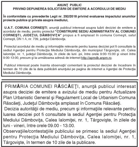 ANUNŢURI By: Ziarul Dambovita Date: 11/11/2020 FacebookTwitterPinterestWhatsApp ANUNŢURI Articolul precedentAIOANI, IN ECHIPA ETAPEI, SĂNDOI E ANTRENORUL RUNDEIArticolul următorDoi turişti din Ilfov au fost sprijiniţi de jandarmii montani Ziarul Dambovita LĂSAȚI UN MESAJ Renunțați la răspuns Comentariu: Vă rugăm să introduceți comentariul dvs.! Nume:* Introduceți aici numele dvs. Email:* Ați introdus o adresă de e-mail incorectă! Vă rugăm să introduceți adresa dvs. de e-mail aici Website: Salvați numele meu, adresa de e-mail și site-ul web în acest browser pentru data viitoare i comentariu. Popular Activitate educativ-duhovnicească dedicată Sfinților Trei Ierarhi, la Bucșani Eisberg, un reper privind securitatea alimentară a salatelor gata de consum Plafonarea adaosului la alimente, când inflaţia sare de 5% Atenție la bijuterii periculoase! Colierul cu pandantiv fluture vândut online, prezintă riscuri chimice serioase Autoritățile au decis să elimine pagurile impuse laboratoarelor private, astfel încât românii să-și poată face investigații decontate oricând au nevoie, nu doar în primele... ȘtiriDâmbovița Chindia Târgoviște joacă acasă!Meci cu ARO Muscelul Câmpulung Muscel, intrare liberă pentru suporteri Roxana - Ionela Botea - 30/01/2026 Vești excelente pentru iubitorii fotbalului din Târgoviște! Chindia Târgoviște... Activitate educativ-duhovnicească dedicată Sfinților Trei Ierarhi, la Bucșani Roxana - Ionela Botea - 30/01/2026 Elevii Școlii Gimnaziale „Dora Dalles” au descoperit valorile prieteniei... Rata șomajului în România: 3,29% la finalul lunii decembrie 2025 Roxana - Ionela Botea - 30/01/2026 Peste 263.000 de persoane, înregistrate ca șomeri la nivel... Școala Gimnazială „Tudor Vladimirescu” din Târgoviște se redeschide luna viitoare Roxana - Ionela Botea - 30/01/2026 Condiții moderne și sigure pentru elevi. Primarul municipiului Târgoviște a...