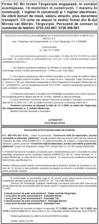 ANUNŢURI By: Ziarul Dambovita Date: 17/11/2020 FacebookTwitterPinterestWhatsApp ANUNŢURI Articolul precedentEuro a adormit la 4,87 leiArticolul următorMuzeul de Etnografie şi Folclor Pucioasa şi-a redeschis porţile Ziarul Dambovita LĂSAȚI UN MESAJ Renunțați la răspuns Comentariu: Vă rugăm să introduceți comentariul dvs.! Nume:* Introduceți aici numele dvs. Email:* Ați introdus o adresă de e-mail incorectă! Vă rugăm să introduceți adresa dvs. de e-mail aici Website: Salvați numele meu, adresa de e-mail și site-ul web în acest browser pentru data viitoare i comentariu. Popular Activitate educativ-duhovnicească dedicată Sfinților Trei Ierarhi, la Bucșani Eisberg, un reper privind securitatea alimentară a salatelor gata de consum Plafonarea adaosului la alimente, când inflaţia sare de 5% Atenție la bijuterii periculoase! Colierul cu pandantiv fluture vândut online, prezintă riscuri chimice serioase Autoritățile au decis să elimine pagurile impuse laboratoarelor private, astfel încât românii să-și poată face investigații decontate oricând au nevoie, nu doar în primele... ȘtiriDâmbovița Chindia Târgoviște joacă acasă!Meci cu ARO Muscelul Câmpulung Muscel, intrare liberă pentru suporteri Roxana - Ionela Botea - 30/01/2026 Vești excelente pentru iubitorii fotbalului din Târgoviște! Chindia Târgoviște... Activitate educativ-duhovnicească dedicată Sfinților Trei Ierarhi, la Bucșani Roxana - Ionela Botea - 30/01/2026 Elevii Școlii Gimnaziale „Dora Dalles” au descoperit valorile prieteniei... Rata șomajului în România: 3,29% la finalul lunii decembrie 2025 Roxana - Ionela Botea - 30/01/2026 Peste 263.000 de persoane, înregistrate ca șomeri la nivel... Școala Gimnazială „Tudor Vladimirescu” din Târgoviște se redeschide luna viitoare Roxana - Ionela Botea - 30/01/2026 Condiții moderne și sigure pentru elevi. Primarul municipiului Târgoviște a...