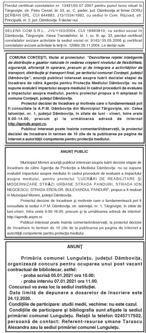 ANUNŢURI By: Ziarul Dambovita Date: 11/12/2020 FacebookTwitterPinterestWhatsApp ANUNŢURI Articolul precedentEuro a pierdut jumătate de banArticolul următorZiua Internaţională a Muntelui Ziarul Dambovita LĂSAȚI UN MESAJ Renunțați la răspuns Comentariu: Vă rugăm să introduceți comentariul dvs.! Nume:* Introduceți aici numele dvs. Email:* Ați introdus o adresă de e-mail incorectă! Vă rugăm să introduceți adresa dvs. de e-mail aici Website: Salvați numele meu, adresa de e-mail și site-ul web în acest browser pentru data viitoare i comentariu. Popular Activitate educativ-duhovnicească dedicată Sfinților Trei Ierarhi, la Bucșani Eisberg, un reper privind securitatea alimentară a salatelor gata de consum Plafonarea adaosului la alimente, când inflaţia sare de 5% Atenție la bijuterii periculoase! Colierul cu pandantiv fluture vândut online, prezintă riscuri chimice serioase Autoritățile au decis să elimine pagurile impuse laboratoarelor private, astfel încât românii să-și poată face investigații decontate oricând au nevoie, nu doar în primele... ȘtiriDâmbovița Chindia Târgoviște joacă acasă!Meci cu ARO Muscelul Câmpulung Muscel, intrare liberă pentru suporteri Roxana - Ionela Botea - 30/01/2026 Vești excelente pentru iubitorii fotbalului din Târgoviște! Chindia Târgoviște... Activitate educativ-duhovnicească dedicată Sfinților Trei Ierarhi, la Bucșani Roxana - Ionela Botea - 30/01/2026 Elevii Școlii Gimnaziale „Dora Dalles” au descoperit valorile prieteniei... Rata șomajului în România: 3,29% la finalul lunii decembrie 2025 Roxana - Ionela Botea - 30/01/2026 Peste 263.000 de persoane, înregistrate ca șomeri la nivel... Școala Gimnazială „Tudor Vladimirescu” din Târgoviște se redeschide luna viitoare Roxana - Ionela Botea - 30/01/2026 Condiții moderne și sigure pentru elevi. Primarul municipiului Târgoviște a...