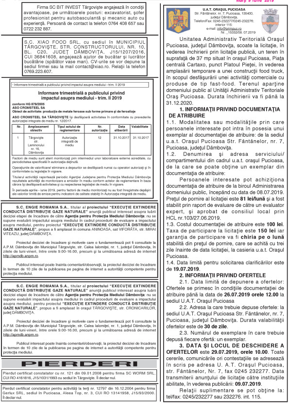 ANUNŢURI By: Ziarul Dambovita Date: 09/07/2019 FacebookTwitterPinterestWhatsApp ANUNŢURI TagsAnunţuri Articolul precedentSORANA, EŞEC ŞI ÎN PROBA DE DUBLUArticolul următorRaportul de activitate al parlamentarului dâmboviţean, Corneliu Ştefan Ziarul Dambovita LĂSAȚI UN MESAJ Renunțați la răspuns Comentariu: Vă rugăm să introduceți comentariul dvs.! Nume:* Introduceți aici numele dvs. Email:* Ați introdus o adresă de e-mail incorectă! Vă rugăm să introduceți adresa dvs. de e-mail aici Website: Salvați numele meu, adresa de e-mail și site-ul web în acest browser pentru data viitoare i comentariu. Popular Transport ilegal de material lemnos, descoperit de polițiști în Braniștea Activitate educativ-duhovnicească dedicată Sfinților Trei Ierarhi, la Bucșani Eisberg, un reper privind securitatea alimentară a salatelor gata de consum Plafonarea adaosului la alimente, când inflaţia sare de 5% Atenție la bijuterii periculoase! Colierul cu pandantiv fluture vândut online, prezintă riscuri chimice serioase ȘtiriDâmbovița Atenție, nou val de fraude financiare online Roxana - Ionela Botea - 30/01/2026 Autoritățile atrag atenția asupra unei campanii de fraudă online... Transport ilegal de material lemnos, descoperit de polițiști în Braniștea Roxana - Ionela Botea - 30/01/2026 Polițiștii din cadrul Poliției Orașului Titu au identificat un... AJF Dâmbovița dă startul înscrierilor pentru un nou curs de formare arbitri Roxana - Ionela Botea - 30/01/2026 „Intră în joc!” Asociația Județeană de Fotbal Dâmbovița a anunțat... Chindia Târgoviște joacă acasă!Meci cu ARO Muscelul Câmpulung Muscel, intrare liberă pentru suporteri Roxana - Ionela Botea - 30/01/2026 Vești excelente pentru iubitorii fotbalului din Târgoviște! Chindia Târgoviște...