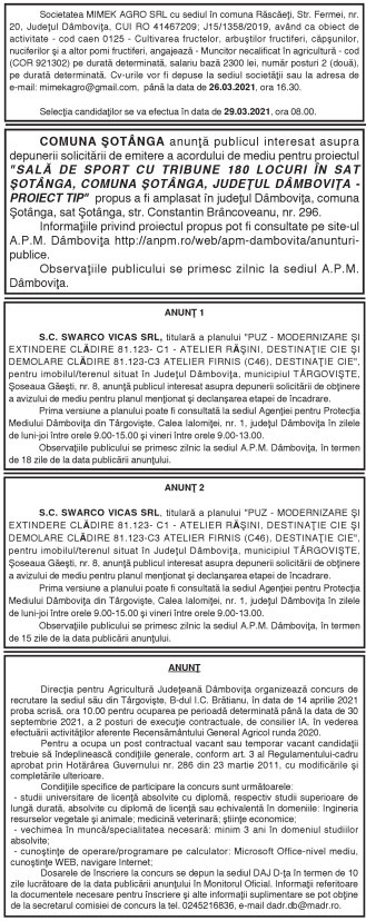 ANUNŢURI By: Ziarul Dambovita Date: 22/03/2021 FacebookTwitterPinterestWhatsApp TagsAnunţuri Articolul precedentbookbox Regăsiri Târgoviştea mea, de Theodor Nicolin, Editura BibliothecaArticolul următorZiua paşaportului românesc Ziarul Dambovita LĂSAȚI UN MESAJ Renunțați la răspuns Comentariu: Vă rugăm să introduceți comentariul dvs.! Nume:* Introduceți aici numele dvs. Email:* Ați introdus o adresă de e-mail incorectă! Vă rugăm să introduceți adresa dvs. de e-mail aici Website: Salvați numele meu, adresa de e-mail și site-ul web în acest browser pentru data viitoare i comentariu. Popular Activitate educativ-duhovnicească dedicată Sfinților Trei Ierarhi, la Bucșani Eisberg, un reper privind securitatea alimentară a salatelor gata de consum Plafonarea adaosului la alimente, când inflaţia sare de 5% Atenție la bijuterii periculoase! Colierul cu pandantiv fluture vândut online, prezintă riscuri chimice serioase Autoritățile au decis să elimine pagurile impuse laboratoarelor private, astfel încât românii să-și poată face investigații decontate oricând au nevoie, nu doar în primele... ȘtiriDâmbovița Chindia Târgoviște joacă acasă!Meci cu ARO Muscelul Câmpulung Muscel, intrare liberă pentru suporteri Roxana - Ionela Botea - 30/01/2026 Vești excelente pentru iubitorii fotbalului din Târgoviște! Chindia Târgoviște... Activitate educativ-duhovnicească dedicată Sfinților Trei Ierarhi, la Bucșani Roxana - Ionela Botea - 30/01/2026 Elevii Școlii Gimnaziale „Dora Dalles” au descoperit valorile prieteniei... Rata șomajului în România: 3,29% la finalul lunii decembrie 2025 Roxana - Ionela Botea - 30/01/2026 Peste 263.000 de persoane, înregistrate ca șomeri la nivel... Școala Gimnazială „Tudor Vladimirescu” din Târgoviște se redeschide luna viitoare Roxana - Ionela Botea - 30/01/2026 Condiții moderne și sigure pentru elevi. Primarul municipiului Târgoviște a...