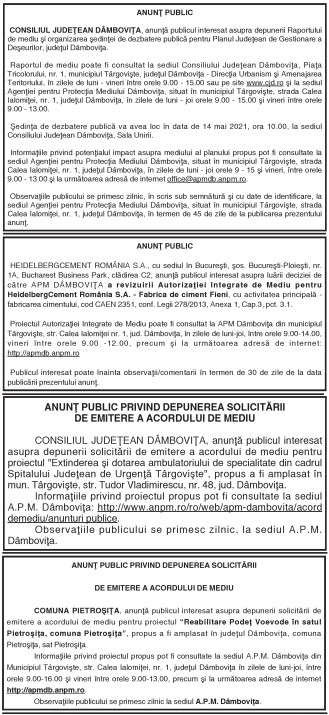 ANUNŢURI By: Ziarul Dambovita Date: 01/04/2021 FacebookTwitterPinterestWhatsApp ANUNŢURI TagsAnunţuri Articolul precedentLumea, condusă de bolnavi (4)Articolul următorCentru mobil de instruire a populaţiei pentru răspuns la situaţii de urgenţă Ziarul Dambovita LĂSAȚI UN MESAJ Renunțați la răspuns Comentariu: Vă rugăm să introduceți comentariul dvs.! Nume:* Introduceți aici numele dvs. Email:* Ați introdus o adresă de e-mail incorectă! Vă rugăm să introduceți adresa dvs. de e-mail aici Website: Salvați numele meu, adresa de e-mail și site-ul web în acest browser pentru data viitoare i comentariu. Popular Activitate educativ-duhovnicească dedicată Sfinților Trei Ierarhi, la Bucșani Eisberg, un reper privind securitatea alimentară a salatelor gata de consum Plafonarea adaosului la alimente, când inflaţia sare de 5% Atenție la bijuterii periculoase! Colierul cu pandantiv fluture vândut online, prezintă riscuri chimice serioase Autoritățile au decis să elimine pagurile impuse laboratoarelor private, astfel încât românii să-și poată face investigații decontate oricând au nevoie, nu doar în primele... ȘtiriDâmbovița Chindia Târgoviște joacă acasă!Meci cu ARO Muscelul Câmpulung Muscel, intrare liberă pentru suporteri Roxana - Ionela Botea - 30/01/2026 Vești excelente pentru iubitorii fotbalului din Târgoviște! Chindia Târgoviște... Activitate educativ-duhovnicească dedicată Sfinților Trei Ierarhi, la Bucșani Roxana - Ionela Botea - 30/01/2026 Elevii Școlii Gimnaziale „Dora Dalles” au descoperit valorile prieteniei... Rata șomajului în România: 3,29% la finalul lunii decembrie 2025 Roxana - Ionela Botea - 30/01/2026 Peste 263.000 de persoane, înregistrate ca șomeri la nivel... Școala Gimnazială „Tudor Vladimirescu” din Târgoviște se redeschide luna viitoare Roxana - Ionela Botea - 30/01/2026 Condiții moderne și sigure pentru elevi. Primarul municipiului Târgoviște a...