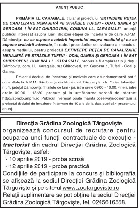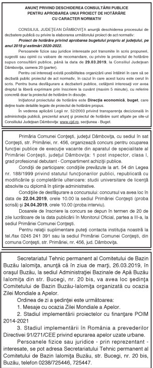 ANUNŢURI By: Ziarul Dambovita Date: 19/03/2019 FacebookTwitterPinterestWhatsApp ANUNŢURI TagsAnunţuri Articolul precedentCSM TÂRGOVIŞTE, PE LOCUL 3 LA FINALUL SEZONULUI REGULAT!Articolul următorCandidaturile pentru Parlamentul European trebuie depuse şi înregistrate până pe 28 martie Ziarul Dambovita LĂSAȚI UN MESAJ Renunțați la răspuns Comentariu: Vă rugăm să introduceți comentariul dvs.! Nume:* Introduceți aici numele dvs. Email:* Ați introdus o adresă de e-mail incorectă! Vă rugăm să introduceți adresa dvs. de e-mail aici Website: Salvați numele meu, adresa de e-mail și site-ul web în acest browser pentru data viitoare i comentariu. Δ Acest site folosește Akismet pentru a reduce spamul. Află cum sunt procesate datele comentariilor tale. Popular Adrenalină și suspans la Cinema Independența din Târgoviște: „Anaconda” ajunge pe marele ecran A apărut Almanahul bisericesc 2026 al Arhiepiscopiei Târgoviștei – o oglindă a vieții pastorale și academice contemporane CJ Dâmbovița încheie o nouă ediție a programului de internship Avertisment pentru turiști: Recomandările jandarmilor montani înainte de urcarea în Bucegi Restricții de circulație în Ungaria, pe Drumul Principal 42 punct frontieră Artand-Borș, începând cu 1 ianuarie 2026! ȘtiriDâmbovița Județul Dâmbovița, sub asediul gerului – temperaturi de până la -11 grade Celsius Roxana - Ionela Botea - 02/01/2026 Dimineață geroasă – 2 ianuarie , temperaturi minime înregistrate... Vești bune pentru fermieri: începe depunerea cererilor pentru bunăstarea animalelor (DR-06) Roxana - Ionela Botea - 02/01/2026 Fermierii din sectorul zootehnic au motive de optimism la... Mani Gyenes, din nou la startul Raliului Dakar: România are reprezentant în cursa supremă a anduranței Roxana - Ionela Botea - 02/01/2026 România va fi din nou reprezentată la cel mai... Noi taxe și impozite în vigoare de la 1 ianuarie 2026 Roxana - Ionela Botea - 02/01/2026 Începând cu 1 ianuarie 2026, în România au intrat...