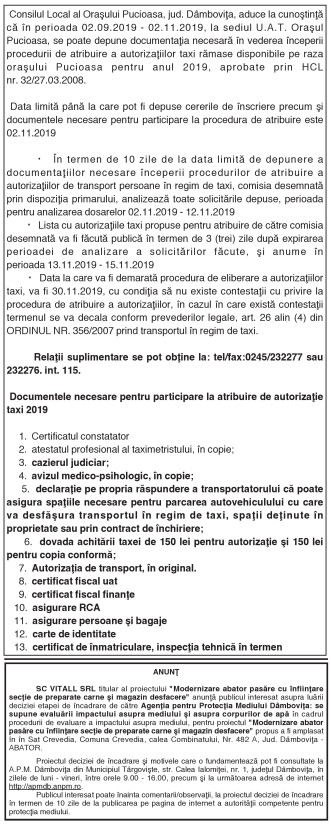 ANUNŢURI By: Ziarul Dambovita Date: 28/08/2019 FacebookTwitterPinterestWhatsApp ANUNŢURI TagsAnunţuri Articolul precedentCercetaţi sub aspectul săvârşirii de infracţiuni contra siguranţei circulaţiei pe drumurile publiceArticolul următorAnunţ public privind decizia etapei de încadrare Ziarul Dambovita LĂSAȚI UN MESAJ Renunțați la răspuns Comentariu: Vă rugăm să introduceți comentariul dvs.! Nume:* Introduceți aici numele dvs. Email:* Ați introdus o adresă de e-mail incorectă! Vă rugăm să introduceți adresa dvs. de e-mail aici Website: Salvați numele meu, adresa de e-mail și site-ul web în acest browser pentru data viitoare i comentariu. Δ Acest site folosește Akismet pentru a reduce spamul. Află cum sunt procesate datele comentariilor tale. Popular Fonduri europene de peste 150 de milioane de euro pentru legume și cartofi Ministerul Energiei: Peste 77.000 de gospodării reconectate după avariile provocate de viscol și ninsori Mâine, 6 ianuarie , Boboteaza, sărbătorită la Catedrala din Târgoviște, ÎPS Nifon va oficia Sfânta Liturghie și Sfințirea Mare a Apei Mecanism de control al concediilor medicale pe mai multe palierer, dacă se constată că certificatul de concediul medical a fost eliberat fără respectarea... Primarul Târgoviștei critică dur modificările legislative privind taxele locale: Unul dintre cele mai cinice acte normative din ultimii 30 de ani ȘtiriDâmbovița Fonduri europene de peste 150 de milioane de euro pentru legume și cartofi Roxana - Ionela Botea - 05/01/2026 AFIR lansează o nouă sesiune de proiecte Ministerul Agriculturii și... Ministerul Energiei: Peste 77.000 de gospodării reconectate după avariile provocate de viscol și ninsori Roxana - Ionela Botea - 05/01/2026 Ministerul Energiei a transmis o informare privind stadiul lucrărilor... Trei persoane rănite într-un accident rutier la Vulcana-Băi Roxana - Ionela Botea - 05/01/2026 Trei persoane rănite într-un accident rutier la Vulcana-Băi Mare sperietură... Mâine, 6 ianuarie , Boboteaza, sărbătorită la Catedrala din Târgoviște, ÎPS Nifon va oficia Sfânta Liturghie și Sfințirea Mare a Apei Roxana - Ionela Botea - 05/01/2026 Cu prilejul marii sărbători a Botezului Domnului, marți, 6...