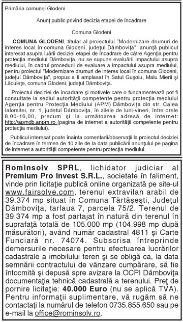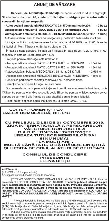 ANUNŢURI By: Ziarul Dambovita Date: 30/09/2019 FacebookTwitterPinterestWhatsApp ANUNŢURI TagsAnunţuri Articolul precedentSORANA CÎRSTEA A RATAT PRIMUL TITLU WTA DIN 2G19Articolul următor900 de tineri au participat la crosul desfăşurat în oraşul Pucioasa Ziarul Dambovita LĂSAȚI UN MESAJ Renunțați la răspuns Comentariu: Vă rugăm să introduceți comentariul dvs.! Nume:* Introduceți aici numele dvs. Email:* Ați introdus o adresă de e-mail incorectă! Vă rugăm să introduceți adresa dvs. de e-mail aici Website: Salvați numele meu, adresa de e-mail și site-ul web în acest browser pentru data viitoare i comentariu. Popular Transport ilegal de material lemnos, descoperit de polițiști în Braniștea Activitate educativ-duhovnicească dedicată Sfinților Trei Ierarhi, la Bucșani Eisberg, un reper privind securitatea alimentară a salatelor gata de consum Plafonarea adaosului la alimente, când inflaţia sare de 5% Atenție la bijuterii periculoase! Colierul cu pandantiv fluture vândut online, prezintă riscuri chimice serioase ȘtiriDâmbovița Atenție, nou val de fraude financiare online Roxana - Ionela Botea - 30/01/2026 Autoritățile atrag atenția asupra unei campanii de fraudă online... Transport ilegal de material lemnos, descoperit de polițiști în Braniștea Roxana - Ionela Botea - 30/01/2026 Polițiștii din cadrul Poliției Orașului Titu au identificat un... AJF Dâmbovița dă startul înscrierilor pentru un nou curs de formare arbitri Roxana - Ionela Botea - 30/01/2026 „Intră în joc!” Asociația Județeană de Fotbal Dâmbovița a anunțat... Chindia Târgoviște joacă acasă!Meci cu ARO Muscelul Câmpulung Muscel, intrare liberă pentru suporteri Roxana - Ionela Botea - 30/01/2026 Vești excelente pentru iubitorii fotbalului din Târgoviște! Chindia Târgoviște...