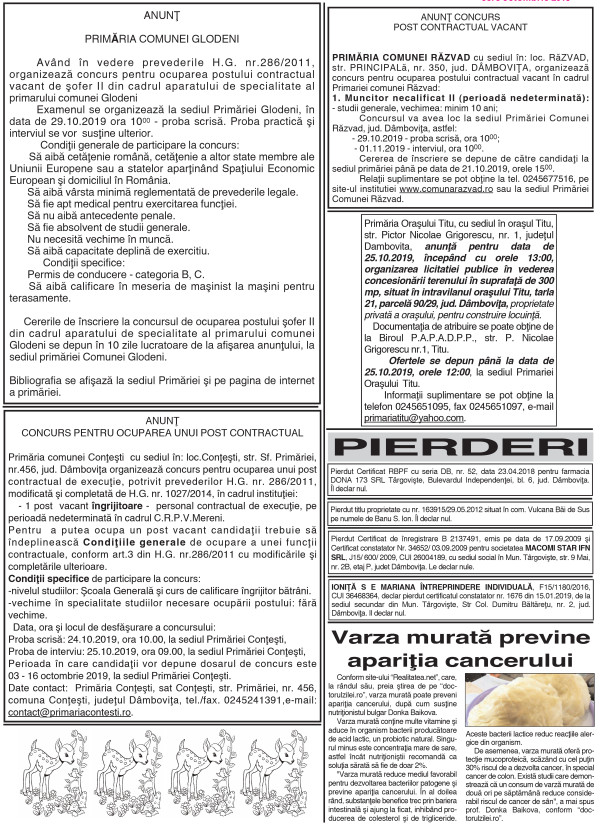 ANUNŢURI By: Ziarul Dambovita Date: 03/10/2019 FacebookTwitterPinterestWhatsApp ANUNŢURI TagsAnunţuri Articolul precedentCSM JOACĂ ÎN NOIEMBRIE MECIUL CU ALEXANDRIAArticolul următor„Adoptă un km!” la Răcari Ziarul Dambovita LĂSAȚI UN MESAJ Renunțați la răspuns Comentariu: Vă rugăm să introduceți comentariul dvs.! Nume:* Introduceți aici numele dvs. Email:* Ați introdus o adresă de e-mail incorectă! Vă rugăm să introduceți adresa dvs. de e-mail aici Website: Salvați numele meu, adresa de e-mail și site-ul web în acest browser pentru data viitoare i comentariu. Popular Transport ilegal de material lemnos, descoperit de polițiști în Braniștea Activitate educativ-duhovnicească dedicată Sfinților Trei Ierarhi, la Bucșani Eisberg, un reper privind securitatea alimentară a salatelor gata de consum Plafonarea adaosului la alimente, când inflaţia sare de 5% Atenție la bijuterii periculoase! Colierul cu pandantiv fluture vândut online, prezintă riscuri chimice serioase ȘtiriDâmbovița Atenție, nou val de fraude financiare online Roxana - Ionela Botea - 30/01/2026 Autoritățile atrag atenția asupra unei campanii de fraudă online... Transport ilegal de material lemnos, descoperit de polițiști în Braniștea Roxana - Ionela Botea - 30/01/2026 Polițiștii din cadrul Poliției Orașului Titu au identificat un... AJF Dâmbovița dă startul înscrierilor pentru un nou curs de formare arbitri Roxana - Ionela Botea - 30/01/2026 „Intră în joc!” Asociația Județeană de Fotbal Dâmbovița a anunțat... Chindia Târgoviște joacă acasă!Meci cu ARO Muscelul Câmpulung Muscel, intrare liberă pentru suporteri Roxana - Ionela Botea - 30/01/2026 Vești excelente pentru iubitorii fotbalului din Târgoviște! Chindia Târgoviște...