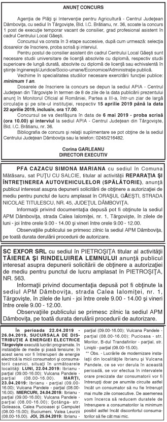 ANUNŢURI By: Ziarul Dambovita Date: 15/04/2019 FacebookTwitterPinterestWhatsApp ANUNŢURI TagsAnunţuri Articolul precedentCSM TÂRGOVIŞTE A RATAT CALIFICAREA ÎN SEMIFINALELE LIGII NAŢIONALEArticolul următorAdministraţia de la Şotânga asigură în 2019, cofinanţarea pentru a continua investiţiile Ziarul Dambovita LĂSAȚI UN MESAJ Renunțați la răspuns Comentariu: Vă rugăm să introduceți comentariul dvs.! Nume:* Introduceți aici numele dvs. Email:* Ați introdus o adresă de e-mail incorectă! Vă rugăm să introduceți adresa dvs. de e-mail aici Website: Salvați numele meu, adresa de e-mail și site-ul web în acest browser pentru data viitoare i comentariu. Δ Acest site folosește Akismet pentru a reduce spamul. Află cum sunt procesate datele comentariilor tale. Popular Adrenalină și suspans la Cinema Independența din Târgoviște: „Anaconda” ajunge pe marele ecran A apărut Almanahul bisericesc 2026 al Arhiepiscopiei Târgoviștei – o oglindă a vieții pastorale și academice contemporane CJ Dâmbovița încheie o nouă ediție a programului de internship Avertisment pentru turiști: Recomandările jandarmilor montani înainte de urcarea în Bucegi Restricții de circulație în Ungaria, pe Drumul Principal 42 punct frontieră Artand-Borș, începând cu 1 ianuarie 2026! ȘtiriDâmbovița Județul Dâmbovița, sub asediul gerului – temperaturi de până la -11 grade Celsius Roxana - Ionela Botea - 02/01/2026 Dimineață geroasă – 2 ianuarie , temperaturi minime înregistrate... Vești bune pentru fermieri: începe depunerea cererilor pentru bunăstarea animalelor (DR-06) Roxana - Ionela Botea - 02/01/2026 Fermierii din sectorul zootehnic au motive de optimism la... Mani Gyenes, din nou la startul Raliului Dakar: România are reprezentant în cursa supremă a anduranței Roxana - Ionela Botea - 02/01/2026 România va fi din nou reprezentată la cel mai... Noi taxe și impozite în vigoare de la 1 ianuarie 2026 Roxana - Ionela Botea - 02/01/2026 Începând cu 1 ianuarie 2026, în România au intrat...