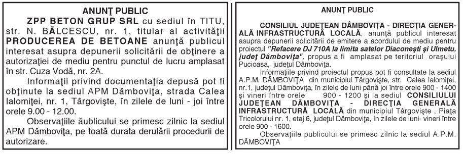 ANUNŢURI By: Ziarul Dambovita Date: 31/10/2019 FacebookTwitterPinterestWhatsApp ANUNŢURI Articolul precedentANUNŢ COTIDIAN DIRECŢIA DE ADMINISTRARE A PATRIMONIULUI PUBLIC ŞI PRIVAT COMPARTIMENTUL TRANSPORT, AUTORIZAŢII ŞI CONTROLArticolul următorÎncă un pas pentru Dâmboviţa Mall Ziarul Dambovita LĂSAȚI UN MESAJ Renunțați la răspuns Comentariu: Vă rugăm să introduceți comentariul dvs.! Nume:* Introduceți aici numele dvs. Email:* Ați introdus o adresă de e-mail incorectă! Vă rugăm să introduceți adresa dvs. de e-mail aici Website: Salvați numele meu, adresa de e-mail și site-ul web în acest browser pentru data viitoare i comentariu. Δ Acest site folosește Akismet pentru a reduce spamul. Află cum sunt procesate datele comentariilor tale. Popular Mecanism de control al concediilor medicale pe mai multe palierer, dacă se constată că certificatul de concediul medical a fost eliberat fără respectarea... Primarul Târgoviștei critică dur modificările legislative privind taxele locale: Unul dintre cele mai cinice acte normative din ultimii 30 de ani Avertisment privind fraudele online de tip „romance scam”, la început de an Informare meteorologică în vigoare în județul Dâmbovița: precipitații, vânt puternic și risc de polei Adrenalină și suspans la Cinema Independența din Târgoviște: „Anaconda” ajunge pe marele ecran ȘtiriDâmbovița Mecanism de control al concediilor medicale pe mai multe palierer, dacă se constată că certificatul de concediul medical a fost eliberat fără respectarea... Roxana - Ionela Botea - 03/01/2026 Control la nivelul Caselor de Asigurări de Sănătate, sub... Chindia Târgoviște spune că nu sunt adevărate informațiile privind o ofertă de 10.000 de euro/lună pentru Daniel Popa Roxana - Ionela Botea - 03/01/2026 Clubul Chindia Târgoviște a reacționat oficial după apariția în... Primarul Târgoviștei critică dur modificările legislative privind taxele locale: Unul dintre cele mai cinice acte normative din ultimii 30 de ani Roxana - Ionela Botea - 03/01/2026 Primarul municipiului Târgoviște, Daniel Cristian Stan, a transmis un... Avertisment privind fraudele online de tip „romance scam”, la început de an Roxana - Ionela Botea - 03/01/2026 La început de an, perioada în care mulți oameni...