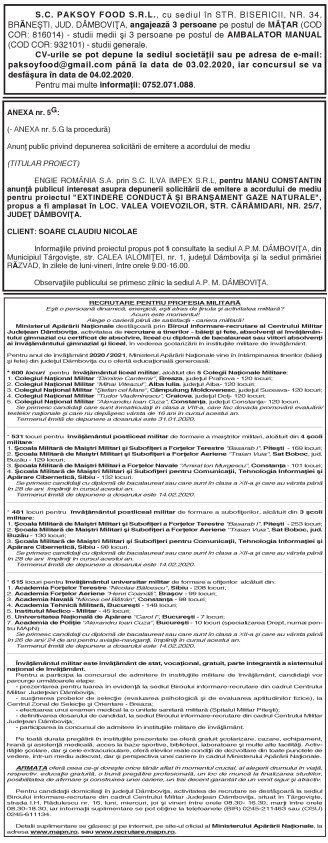 ANUNŢURI By: Ziarul Dambovita Date: 30/01/2020 FacebookTwitterPinterestWhatsApp ANUNŢURI Articolul precedentPsihologia Politică şi Apărarea Socială (CXL)Articolul următorDezvoltarea oraşului Răcari prin Programul Operaţional Regional Ziarul Dambovita LĂSAȚI UN MESAJ Renunțați la răspuns Comentariu: Vă rugăm să introduceți comentariul dvs.! Nume:* Introduceți aici numele dvs. Email:* Ați introdus o adresă de e-mail incorectă! Vă rugăm să introduceți adresa dvs. de e-mail aici Website: Salvați numele meu, adresa de e-mail și site-ul web în acest browser pentru data viitoare i comentariu. Δ Acest site folosește Akismet pentru a reduce spamul. Află cum sunt procesate datele comentariilor tale. Popular Adrenalină și suspans la Cinema Independența din Târgoviște: „Anaconda” ajunge pe marele ecran A apărut Almanahul bisericesc 2026 al Arhiepiscopiei Târgoviștei – o oglindă a vieții pastorale și academice contemporane CJ Dâmbovița încheie o nouă ediție a programului de internship Avertisment pentru turiști: Recomandările jandarmilor montani înainte de urcarea în Bucegi Restricții de circulație în Ungaria, pe Drumul Principal 42 punct frontieră Artand-Borș, începând cu 1 ianuarie 2026! ȘtiriDâmbovița Județul Dâmbovița, sub asediul gerului – temperaturi de până la -11 grade Celsius Roxana - Ionela Botea - 02/01/2026 Dimineață geroasă – 2 ianuarie , temperaturi minime înregistrate... Vești bune pentru fermieri: începe depunerea cererilor pentru bunăstarea animalelor (DR-06) Roxana - Ionela Botea - 02/01/2026 Fermierii din sectorul zootehnic au motive de optimism la... Mani Gyenes, din nou la startul Raliului Dakar: România are reprezentant în cursa supremă a anduranței Roxana - Ionela Botea - 02/01/2026 România va fi din nou reprezentată la cel mai... Noi taxe și impozite în vigoare de la 1 ianuarie 2026 Roxana - Ionela Botea - 02/01/2026 Începând cu 1 ianuarie 2026, în România au intrat...