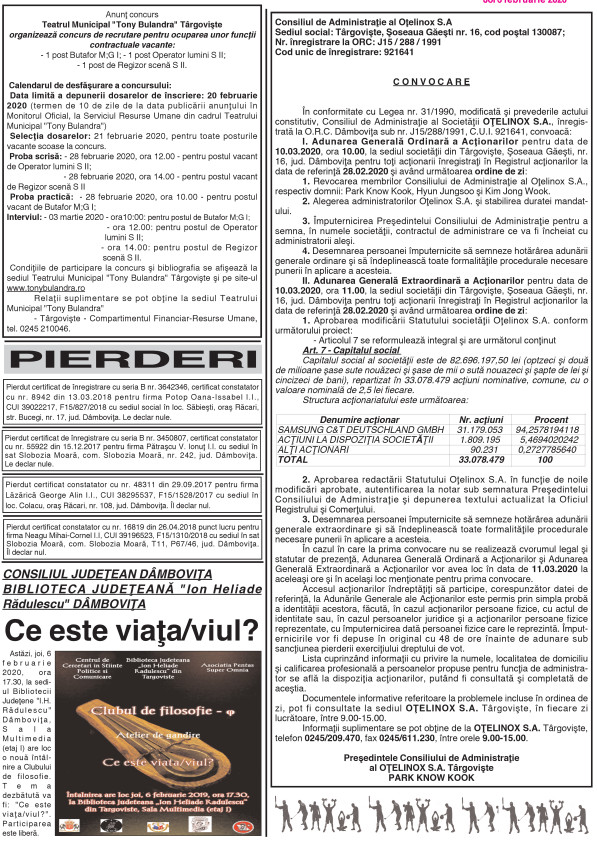 ANUNŢURI By: Ziarul Dambovita Date: 06/02/2020 FacebookTwitterPinterestWhatsApp ANUNŢURI TagsAnunţuri Articolul precedentSORANA CÎRSTEA A URCAT CINCI LOCURI ÎN CLASAMENTUL WTAArticolul următorJandarmul Ionuţ Timofte, locul I la semimaratonul „Gerar” – categoria masculin +35 ani Ziarul Dambovita LĂSAȚI UN MESAJ Renunțați la răspuns Comentariu: Vă rugăm să introduceți comentariul dvs.! Nume:* Introduceți aici numele dvs. Email:* Ați introdus o adresă de e-mail incorectă! Vă rugăm să introduceți adresa dvs. de e-mail aici Website: Salvați numele meu, adresa de e-mail și site-ul web în acest browser pentru data viitoare i comentariu. Popular Transport ilegal de material lemnos, descoperit de polițiști în Braniștea Activitate educativ-duhovnicească dedicată Sfinților Trei Ierarhi, la Bucșani Eisberg, un reper privind securitatea alimentară a salatelor gata de consum Plafonarea adaosului la alimente, când inflaţia sare de 5% Atenție la bijuterii periculoase! Colierul cu pandantiv fluture vândut online, prezintă riscuri chimice serioase ȘtiriDâmbovița Atenție, nou val de fraude financiare online Roxana - Ionela Botea - 30/01/2026 Autoritățile atrag atenția asupra unei campanii de fraudă online... Transport ilegal de material lemnos, descoperit de polițiști în Braniștea Roxana - Ionela Botea - 30/01/2026 Polițiștii din cadrul Poliției Orașului Titu au identificat un... AJF Dâmbovița dă startul înscrierilor pentru un nou curs de formare arbitri Roxana - Ionela Botea - 30/01/2026 „Intră în joc!” Asociația Județeană de Fotbal Dâmbovița a anunțat... Chindia Târgoviște joacă acasă!Meci cu ARO Muscelul Câmpulung Muscel, intrare liberă pentru suporteri Roxana - Ionela Botea - 30/01/2026 Vești excelente pentru iubitorii fotbalului din Târgoviște! Chindia Târgoviște...