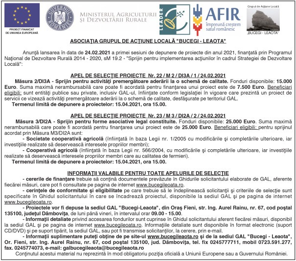 ASOCIAŢIA GRUPUL DE ACŢIUNE LOCALĂ „BUCEGI – LEAOTA” By: Ziarul Dambovita Date: 24/02/2021 FacebookTwitterPinterestWhatsApp TagsASOCIAŢIA GRUPUL DE ACŢIUNE LOCALĂ "BUCEGI - LEAOTA" Articolul precedentSORANA, MAI SUS ÎN CLASAMENTUL WTAArticolul următorApropierea primăverii nu a adus dezgheţul pentru euro Ziarul Dambovita LĂSAȚI UN MESAJ Renunțați la răspuns Comentariu: Vă rugăm să introduceți comentariul dvs.! Nume:* Introduceți aici numele dvs. Email:* Ați introdus o adresă de e-mail incorectă! Vă rugăm să introduceți adresa dvs. de e-mail aici Website: Salvați numele meu, adresa de e-mail și site-ul web în acest browser pentru data viitoare i comentariu. Popular Activitate educativ-duhovnicească dedicată Sfinților Trei Ierarhi, la Bucșani Eisberg, un reper privind securitatea alimentară a salatelor gata de consum Plafonarea adaosului la alimente, când inflaţia sare de 5% Atenție la bijuterii periculoase! Colierul cu pandantiv fluture vândut online, prezintă riscuri chimice serioase Autoritățile au decis să elimine pagurile impuse laboratoarelor private, astfel încât românii să-și poată face investigații decontate oricând au nevoie, nu doar în primele... ȘtiriDâmbovița Chindia Târgoviște joacă acasă!Meci cu ARO Muscelul Câmpulung Muscel, intrare liberă pentru suporteri Roxana - Ionela Botea - 30/01/2026 Vești excelente pentru iubitorii fotbalului din Târgoviște! Chindia Târgoviște... Activitate educativ-duhovnicească dedicată Sfinților Trei Ierarhi, la Bucșani Roxana - Ionela Botea - 30/01/2026 Elevii Școlii Gimnaziale „Dora Dalles” au descoperit valorile prieteniei... Rata șomajului în România: 3,29% la finalul lunii decembrie 2025 Roxana - Ionela Botea - 30/01/2026 Peste 263.000 de persoane, înregistrate ca șomeri la nivel... Școala Gimnazială „Tudor Vladimirescu” din Târgoviște se redeschide luna viitoare Roxana - Ionela Botea - 30/01/2026 Condiții moderne și sigure pentru elevi. Primarul municipiului Târgoviște a...
