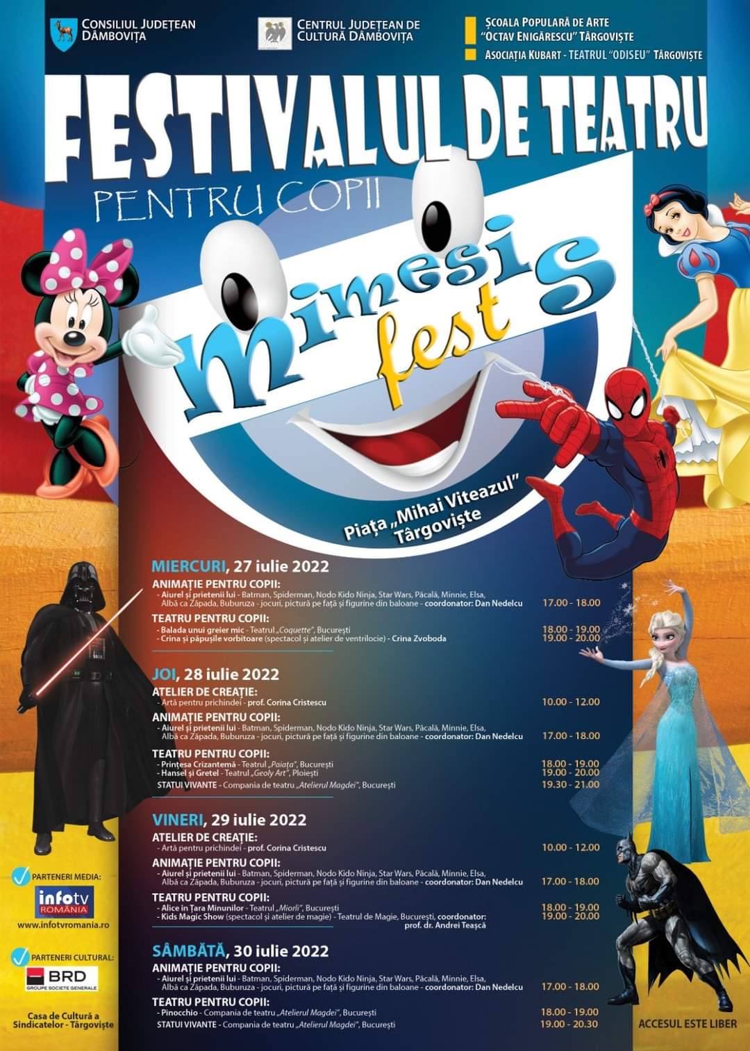 27 iulie, începe Festivalul de teatru pentru copii „Mimesis Fest” și se va încheia 30 iulie 2022, este cea de-a VI-a ediţie, organizată de Consiliul Județean Dâmbovița prin Centrul Județean de Cultură. Evenimentul este dedicat copiilor de toate vârstele, însă, atât părinții, cât și bunicii, sunt invitați să își acorde câteva ore de copilărie. Pe parcursul celor patru zile vor avea loc workshop-uri, ateliere de creaţie, ateliere de pictură pe faţă şi figurine din baloane, precum şi mult așteptatele spectacole de teatru. Basmele, scenetele, fabulele și poeziile vor prinde viață sub bagheta magică a actorilor.