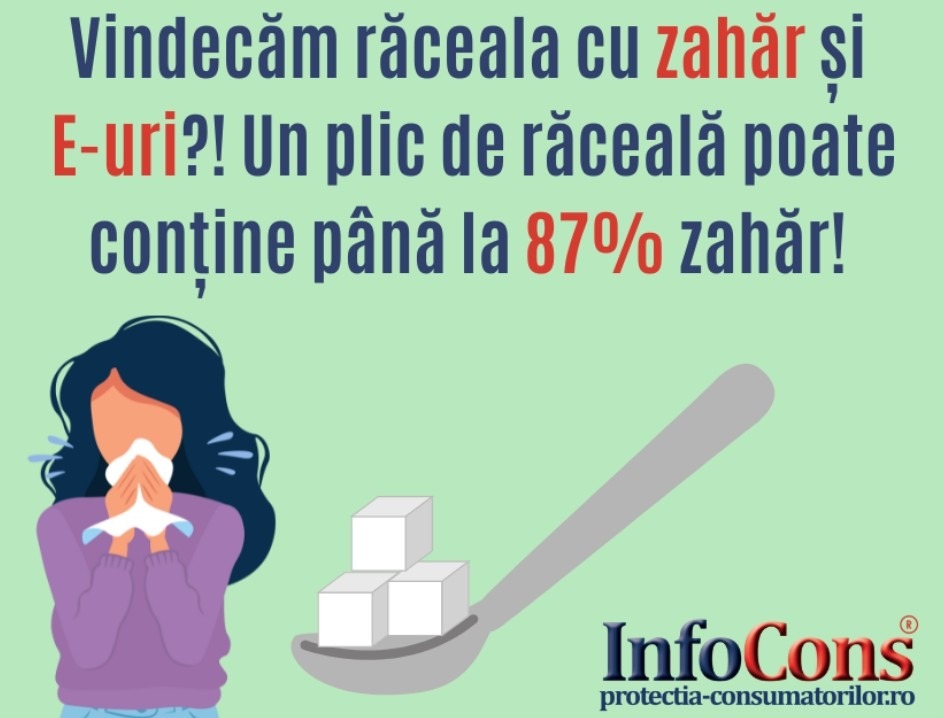 Studiul demarat de InfoCons în 2018, repetat în 2019 și continuat în acest an pe baza etichetelor a 20 de produse tip plic de răceală (soluție pulbere pentru suspensie orală), arată că procentajul la care poate ajunge cantitatea de zahăr dintr-un asemenea plic este covârșitoare. Un plic împotriva răcelii poate conține pâna la 87% zahăr, media fiind 36%, în condițiile în care unele etichete nu furnizează informații cu privire la cantitatea de zahăr conținută de produs.