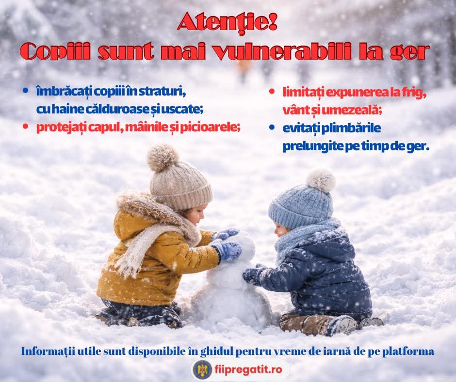 Informații detaliate despre măsurile de prevenire în sezonul rece pot fi consultate în Ghidul pentru vreme de iarnă, disponibil pe platforma de pregătire a populației fiipregatit.ro.