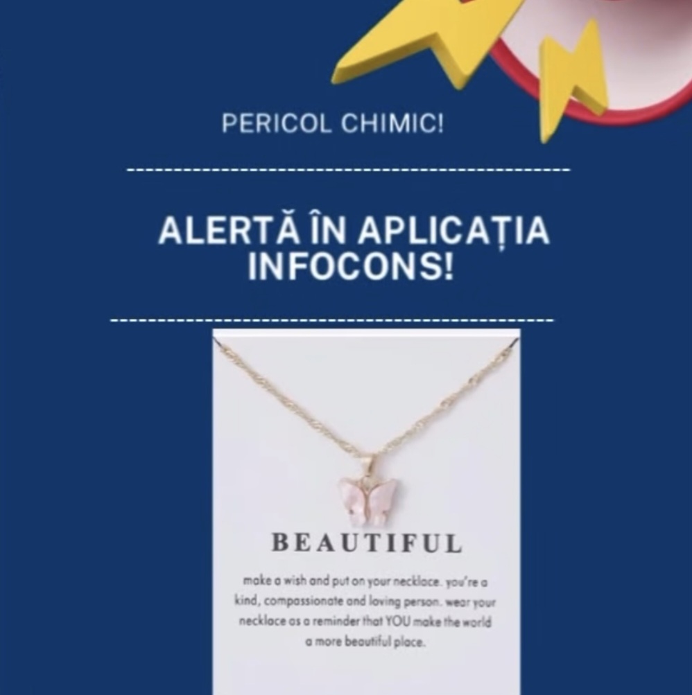 Alertă consumator: bijuterii periculoase online.InfoCons avertizează asupra unui colier cu pandantiv fluture vândut online, în special pe www.accessoirer.no, care prezintă riscuri chimice serioase.
