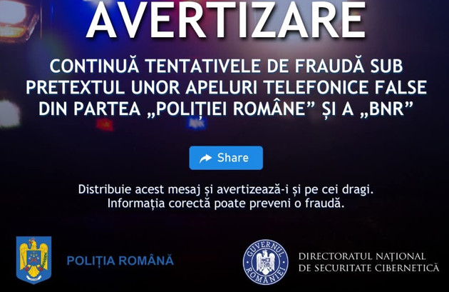 Autoritățile atrag atenția asupra continuării tentativelor de fraudă prin apeluri telefonice în care atacatorii se dau drept reprezentanți ai Poliției Române sau ai Băncii Naționale a României (BNR). Scopul acestora este obținerea de date bancare confidențiale și compromiterea conturilor victimelor.