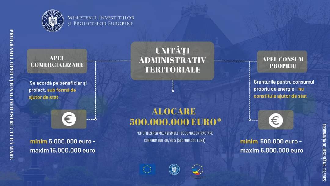Ministerul Investițiilor și Proiectelor Europene prin Autoritatea de Management pentru Programul Operațional Infrastructură Mare, dă startul, în data de 08 noiembrie 2022, ora 10.00, apelului de proiecte dedicat autorităților administrației publice locale – Măsuri pentru sprijinirea investiţiilor în capacităţi de producere energie din surse regenerabile pentru consum propriu la nivelul autorităților publice locale.