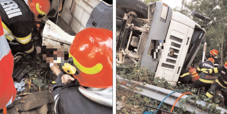 Momente cumplite pentru șoferul unei betoniere. Acesta s-a răsturnat cu betoniera, după care a rămas încarcerat în cabina acesteia.