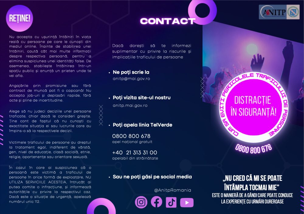 organizate de-a lungul sezonului estival Activitățile campaniei vor fi destinate în principal participanților la evenimentele publice de amploare, desfășurate la nivel national în perioada iulie-septembrie 2023, și vor presupune diseminarea de mesaje anti-trafic în scopul evitării riscurilor traficului de persoane și al adoptării unei conduite preventive. De asemenea, activitățile desfășurate, se vor adresa și publicului general, în vederea creșterii gradului de informare și sensibilizare cu privire la problematica traficului de persoane. Pentru informarea și conștientizarea publicului cu privire la traficul de persoane, campania “Distracție în siguranță!” va include informații clare și accesibile despre semnele și pericolele traficului de persoane, prezente atât în mediul online, cât și în cel outdoor, precum și despre modul în care pot fi prevenite și notificate astfel de situații. Prin intermediul materialelor informativ preventive și de promovare realizate în cadrul campaniei ( pliante, brățări, rucsacuri etc) vor fi transmise mesaje antitrafic care se vor adresa atât persoanelor vulnerabile la trafic cât și publicului general, dar și “cererii” care favorizează traficul de persoane . Nu în ultimul rând, în conținutul materialelor de campanie se regăsesc și îndemnuri menite să elimine prejudecățile referitoare la situația și alegerile victimelor traficului de persoane, subliniind totodată că este necesară respectarea drepturilor și tratamentul egal al acestora, indiferent de vârstă, sex, orientare sexuală, etnie, religie, nivel de educație sau alte aspecte personale.
