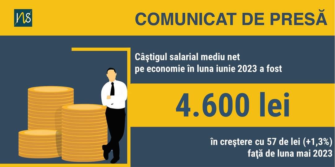 Atât câştigul salarial mediu brut, cât şi cel net au crescut în luna iunie 2023 faţă de luna anterioară, cu 1,9% și, respectiv 1,3%. Câştigul salarial mediu brut a ajuns la 7.364 de lei, cu 135 de lei mai mult faţă de luna mai. În iunie, câştigul salarial mediu net a crescut până la 4.600 de lei, creșterea fiind cu 57 de lei.