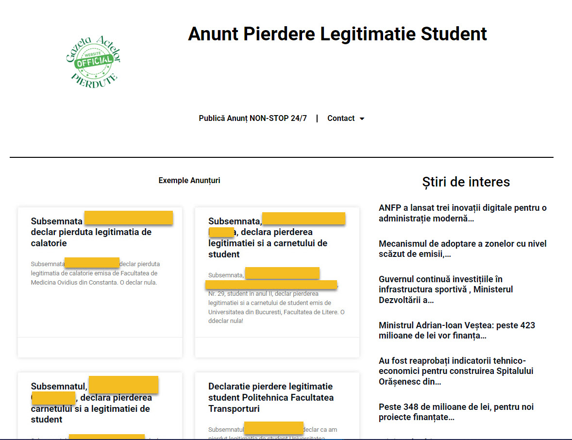 Anunt Pierdere legitimatie Student