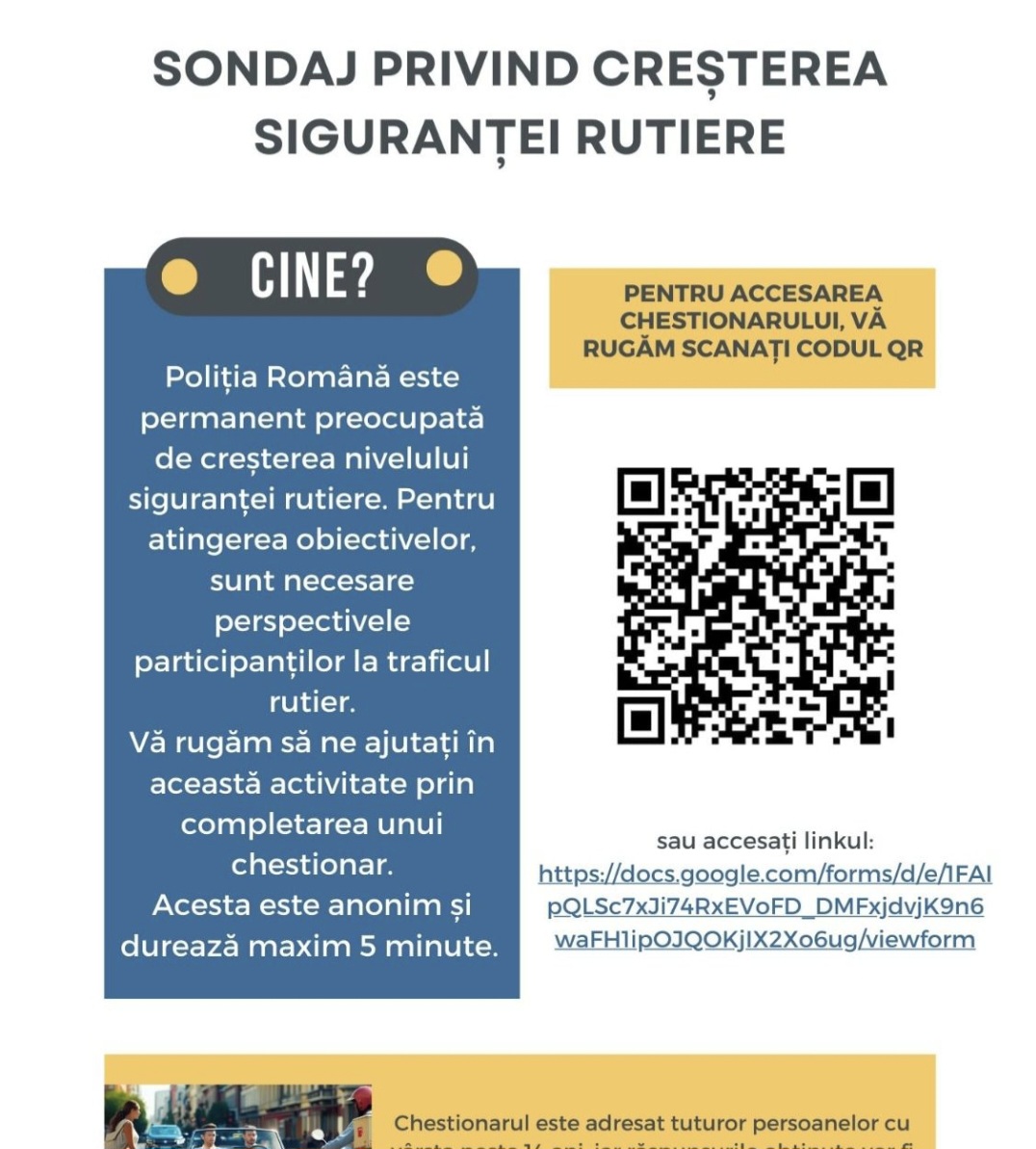 În acest scop, a fost lansat un chestionar online, anonim, adresat tuturor persoanelor cu vârsta de peste 14 ani. Scopul este de a colecta opinii relevante direct de la participanții la trafic – fie ei șoferi, pietoni, bicicliști sau pasageri.